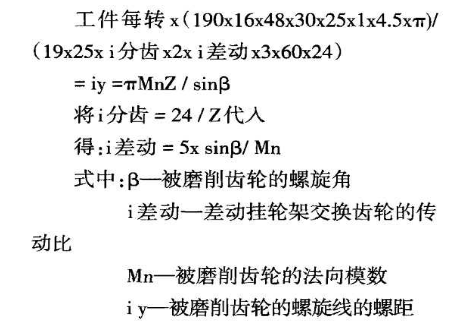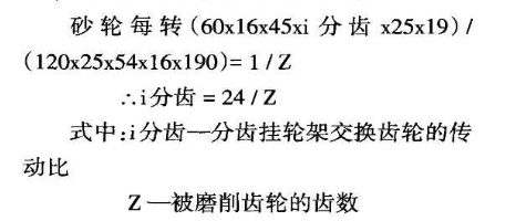 當(dāng)磨削斜齒輪時(shí),與用滾齒刀切削斜齒輪時(shí)一樣,必須調(diào)整差動(dòng)掛輪架,掛輪架系根據(jù)從工作主軸到進(jìn)給絲杠運(yùn)動(dòng)鏈的運(yùn)動(dòng)平衡方程式來(lái)進(jìn)行調(diào)整: