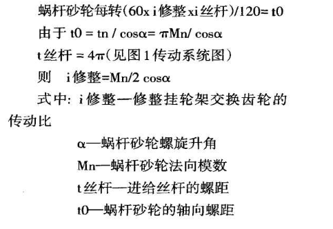 當(dāng)修整蝸桿砂輪時(shí),要調(diào)配單獨(dú)的交換齒輪掛輪架,這時(shí)蝸桿砂輪每一轉(zhuǎn)時(shí)必須使修整機(jī)構(gòu)移動(dòng)相當(dāng)于蝸桿砂輪軸向螺距毫米。因此修整掛輪可根據(jù)從砂輪主軸到修整機(jī)構(gòu)絲杠運(yùn)動(dòng)鏈的平衡方程式來(lái)調(diào)整: